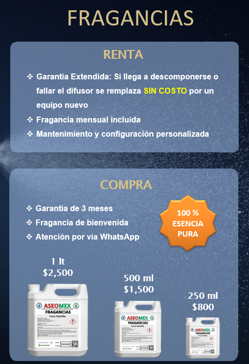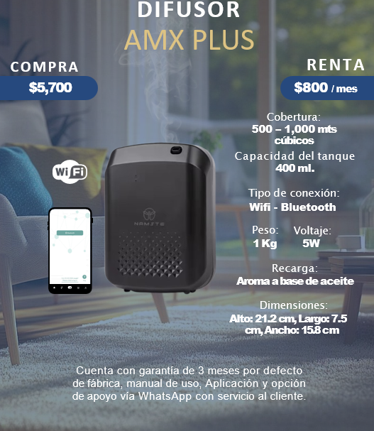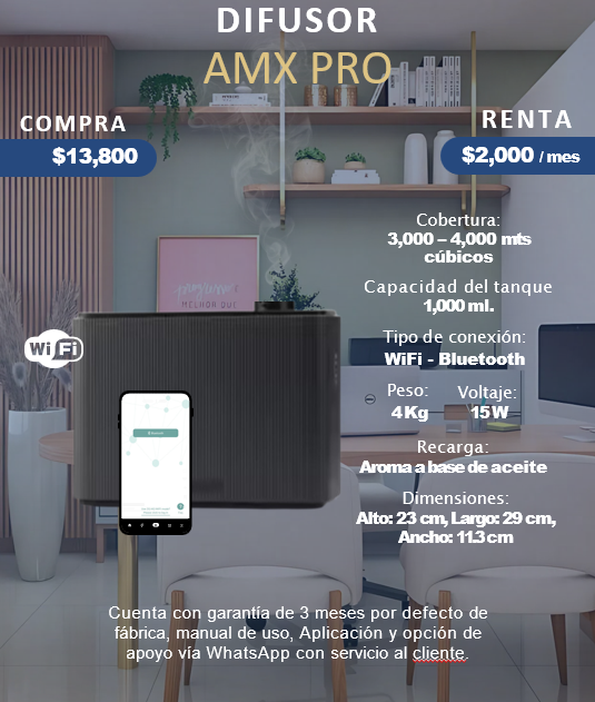 DIFUSORES PROFESIONALES 01 AMX PLUS -Configuración Personalizada-Acudimos al domicilio o empresa.-Gran variedad de fragancias a escoger-Aplicación para configurar los días y horas de trabajo del difusor.-GARANTIA EXTENDIDA Renta:$800 Compra:$1,200 02 AMX PRO -Configuración Personalizada -Acudimos al domicilio o empresa. -Gran variedad de fragancias a escoger -Aplicación para configurar los días y horas de trabajo del difusor. -GARANTIA EXTENDIDA Renta:$2,000 Compra:$13,800 Todos Nuestros Difusores Pueden Facturarse